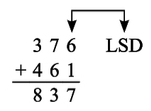 A operação é realizada da direita para a esquerda, começando do dígito menos significativo (LSD, do inglês least-significant-digit). Quando os dígitos da segunda coluna são somados o resultado é , o que gera o "vai um" (ou carry) com valor , que vai para a próxima coluna e, por fim, gera a soma .