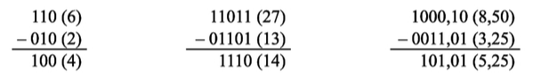 No último caso ocorre o "tomar emprestado" (borrow) da próxima coluna. Como o número à esquerda é menor do que o número à direita, o resultado é negativo. Por enquanto a representação do número negativo segue a mesma forma intuitiva em base 10: usando o sinal "-".