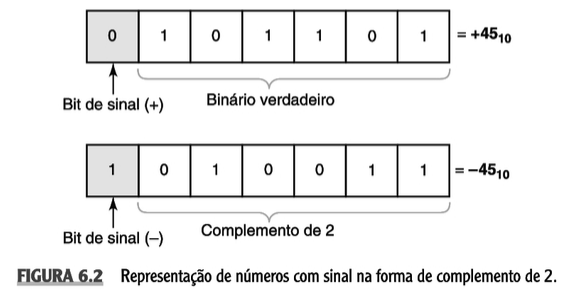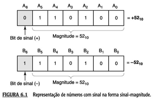 Computadores e calculadoras digitais geralmente operam com números negativos e positivos. Assim, é necessário utilizar o sinal do número ( ou ). Para isso, acrescenta-se ao número outro bit, chamado bit de sinal. A convenção é que o valor represente o sinal e o valor represente o sinal , o que é ilustrado pela figura a seguir.