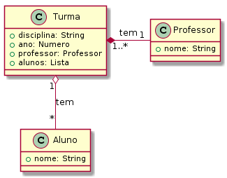 As classes Turma e Professor estão relacionadas entre si e indicam que o professor faz parte da turma. Em outras palavras, é necessário que haja um professor para que a turma exista. Esse condicional, essa restrição é representada pela composição. Em termos do Diagrama de classes, esse relacionamento é representado por um losango preenchido do lado "todo" da relação: turma é o "todo", enquanto professor é "parte".