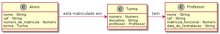 A relação entre duas classes tem um nome (rótulo da seta) e uma seta (direcionada, por padrão). Na classe Aluno o atributo turma é do tipo Turma. Essa é uma observação importante porque ela explica o motivo de a seta da relação está matriculado em ser direcionada (partindo de Aluno e chegando em Turma). Da mesma, na classe Turma o atributo professor é do tipo Professor e isso explica a relação tem (entre as classes Turma e Professor).
