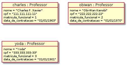 Considerando que tipo seja Professor, poderíamos representar a tabela anterior usando o Diagrama de objetos da UML ilustrado pela figura a seguir.